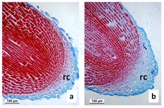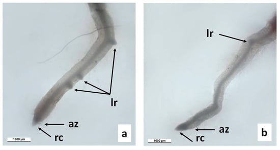 Effect of imazethapyr on root anatomy of rapeseed oil: (a) 240 µg a.i./kg soil; (b) EC20 treatment;rc—root cap; az—beginning of absorption zone; lr—lateral root primordia (The Figure is representative of each treatment).