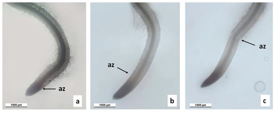 Effect of imazethapyr on root anatomy of wheat: (a) 240 µg a.i./kg soil; (b) ED20 treatment; (c) ED10 treatment; az—beginning of the absorption zone (The Figure is representative of each treatment).