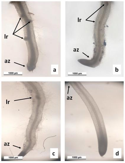 Effect of imazethapyr on root anatomy of white mustard: (a) 240 µg a.i./kg soil; (b) ED20 treatment; (c) ED10 treatment; (d) control; az—beginning of absorption zone; lr—lateral root primordia (The Figure is representative of each treatment).