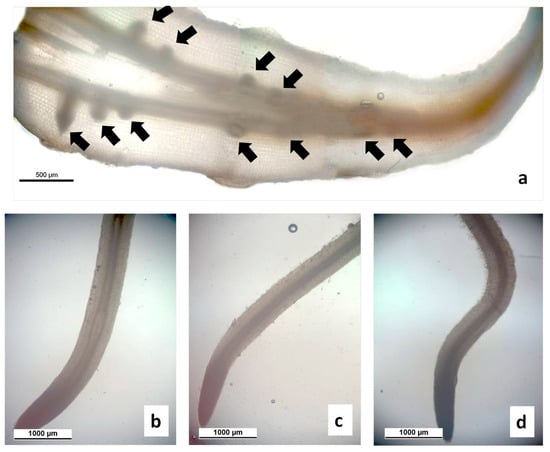 Effect of imazethapyr on root anatomy of sunflower: (a) 240 µg a.i./kg soil; (b) ED20 treatment; (c) ED10 treatment; (d) control; lateral root primordia are indicated by arrows(The Figure is representative of each treatment).