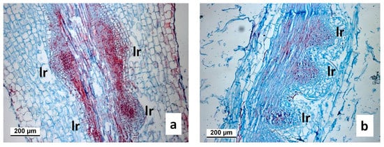 Effect of imazethapyr (240 µg a.i./kg soil) on root anatomy: (a) sunflower; (b) rapeseed oil; lr—lateral root primordia.