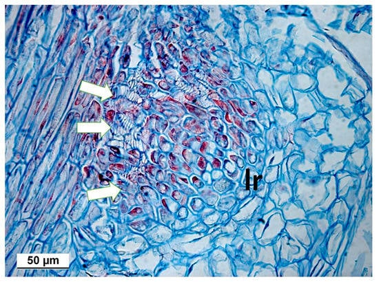 Early differentiation in lateral root primordia of rapeseed oil, induced by imazethapyr (lr—lateral root primordia; differentiation of vascular tissue is indicated by arrows).