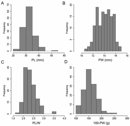 Frequency distribution of phenotypic variation of four pod-related traits in 136 peanut accessions. (A–D) represent the frequency distributions of PL, PW, PL/W, and 100-PW, respectively. The averaged phenotype value of two environments for each trait was used.