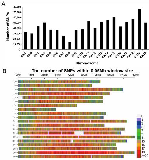 SNP markers density and distribution across the genome of peanut. (A) The distribution of SNP markers on 20 chromosomes of peanut. (B) SNP markers density on each chromosome. The horizontal axis shows chromosome length (Mb), and the vertical axis shows the 20 chromosomes.