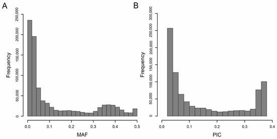Minor allelic frequency (MAF) and polymorphism information content (PIC) analysis based on 884,737 SNPs in 136 peanut accessions. (A) Distribution of minor allele frequency (MAF). (B) Polymorphism information content (PIC).