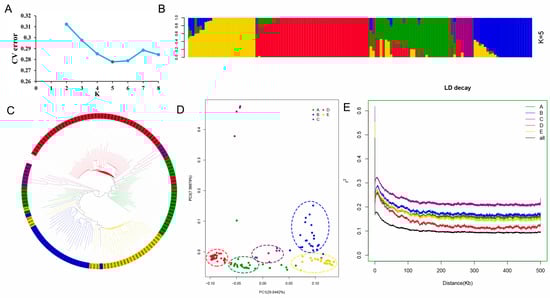 To elucidate the genetic and evolutionary relationships among 136 peanut accessions, population structure analysis, phylogenetic analysis, principal component analysis and linkage disequilibrium attenuation analysis were conducted based on 884,737 SNPs. The Admixture software (ver. 1.3.0) was used to evaluate the population structure of 136 peanut accessions with K values ranging from 2 to 8. When K = 5, the cross validation (CV) error value was at the inflection point and showed the lowest value, indicating that the population could be divided into five subpopulations (Figure 4A,B and Figure S1). The five subpopulations were named A, B, C, D and E, among which the A subpopulation contained 28 peanut accessions, and 25 belonged to A. hypogaea var. vulgaris. Among the 23 peanut accessions contained in B subpopulation, 22 belonged to var. fastigiata. Among the eleven peanut accessions contained in C subpopulation, seven belonged to var. hirsuta. D is the mixed subpopulation, which consists of eighteen var. fastigiata, seventeen var. vulgaris and seven var. hirsuta. Among the 27 peanut accessions contained in subpopulation E, 23 belonged to var. vulgaris. It can be seen that there is a certain correlation between population structure and peanut subspecies classification. In addition, phylogenetic tree and principal component analysis showed that the results were basically consistent with the population structure (Figure 4C,D). Therefore, in order to improve operational efficiency, the principal component analysis matrix will be used to replace the Q matrix at K = 5 for subsequent GWAS.