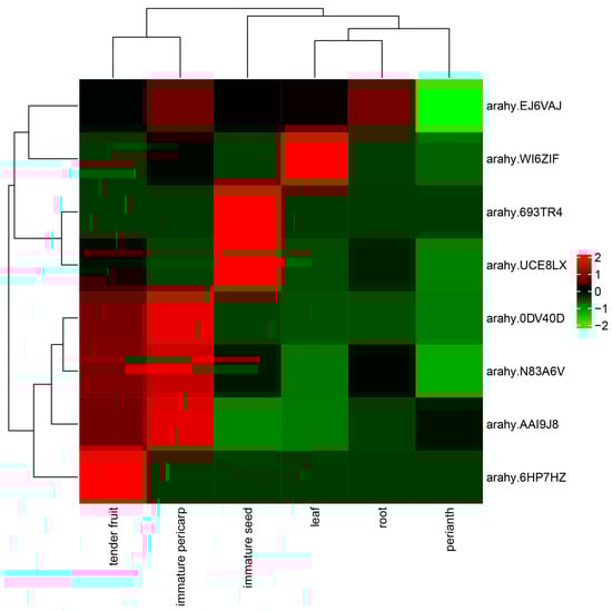 Heatmap profiles of the candidate genes in different tissues of peanut. The color scale represents increased (red) and decreased (green) fold change in the levels of candidate gene transcripts. The horizontal axis represents different peanut tissues (immature seed, root, tender fruit, immature pericarp, leaf and perianth), and the vertical axis stands for different candidate genes.