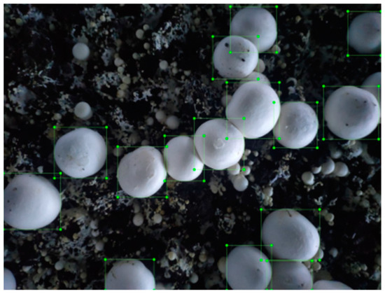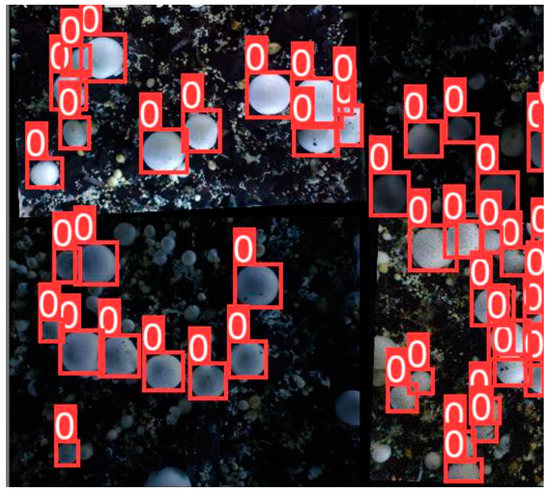 In this experiment, we considered the greater value between the height and the width of the predicted bounding box in the image of Figure 8 as the diameter (in pixels) of the A. bisporus. The spatial resolution [11] was used to calculate the actual diameter (in mm) of the A. bisporus. The spatial resolution indicates the number of independent pixels per millimeter, which is 3 pixels/mm in this study. The relative error of the measurement results is calculated as follows: