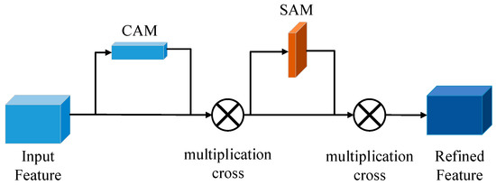 By processing small targets in the images through multiple C3 modules in Backbone, the acquired information on location and feature is usually coarse and easily lost, which may lead to false detection and missed detection of small targets. To improve the accuracy of small target detection, we introduced the CBAM module into the Backbone. The CBAM module consists of the Channel Attention Module (CAM) and the Spatial Attention Module (SAM). CAM and SAM enhance the focus on the channel and spatial effective features of the target, enhance the key features, and reduce redundant features, thus improving the discriminative power of the feature network on the target object. This improvement can decrease the number of computational parameters and save computational power. In this study, the CBAM module was placed after the C3 module, thus effectively increasing the weight of small targets in the whole feature map for easier learning by the network. The flow chart of the CBAM algorithm is shown in Figure 4.