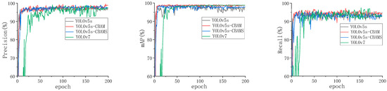From Figure 7, the variations of Precision, mAP, and Recall for the four models were observed as the epochs increased. It is evident that the YOLOv5s-CBAM model achieved a relatively high level of Precision, mAP, and Recall at a lower epoch, followed by YOLOv5s and YOLOv5s-CBAMS. Conversely, the YOLOv7 model showed high performance from an epoch value of 25. YOLOv7 has more network layers and feature pyramids, resulting in a larger number of parameters and, thus, longer parameter optimization time. Figure 7 suggests that the YOLOv5s-CBAM model has stronger detection capabilities in the early stages compared to the other three models. As the epoch value increases, YOLOv5s-CBAM outperforms the other three models, showing less fluctuation, stronger stability, and generalization capabilities.