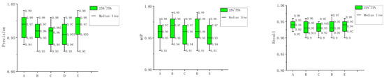 To mitigate the influence of randomness caused by randomly dividing the dataset in an 8:2 ratio and to more effectively assess the reliability of the improved model’s performance, we conducted a fivefold cross-validation experiment on the YOLOv5s-CBAM model. First, we divided the prepared dataset into five mutually exclusive subsets of equal size, namely A_set, B_set, C_set, D_set, and E_set. In each iteration, one subset was selected as the test set while the remaining four subsets were used as the training sets to train the corresponding model. The resulting models were labeled as A, B, C, D, and E, respectively. Model A is obtained specifically using A_set as the test set, while the remaining models are similarly named. The training process of each model was repeated for 200 iterations, and the training results are illustrated in the Figure 9. As shown in the figure, the training results of all five models exhibit a consistent and stable pattern. This suggests that the 8:2 division of the dataset has little effect on the performance of the model, indicating the stability and reliability of the model’s performance indicators. Consequently, we can assert that the experimental outcomes of this study are reliable.
