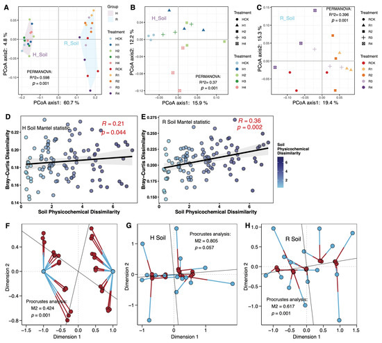 Compositional differences in bacteria of different fertilization samples and the correlation between soil bacterial communities and the soil physicochemical properties of different soil types. Principal coordinates analysis (PCoA) plot based on bacterial species-level abundances using a Bray–Curtis distance metric. (A) All soil samples, (B) loess brown soil (H soil) samples, and (C) red soil (R soil) samples. The Mantel test ((D): loess brown soil; (E): red soil, Spearman) and Procrustes analysis ((F): all soils; (G): loess brown soil; (H): red soil) of the correlation based on the Bray–Curtis results for OTU abundances and Euclidean results for soil physicochemical properties. Permutational multivariate analysis of variance, PERMANOVA.