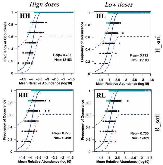 Neutral model applied to assess the effects of random dispersal and ecological drift on the assembly of HL, HH, RL, and RH soils. R2 indicates the goodness of fit to the neutral model. Nm indicates the metacommunity size times immigration. The solid blue lines indicate the best fit to the neutral model, and dashed blue lines represent 95% confidence intervals around the model prediction. H soil: loess brown soil; R soil: red soil; HH: H soil with a high fertilizer dose; HL: H soil with a low fertilizer dose; RH: R soil with a high fertilizer dose; and RL: R soil with a low fertilizer dose.