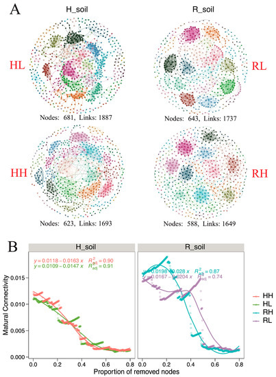 Co-occurrence networks and robustness analysis for microbial communities between H (loess brown) and R (red) soils. (A) The nodes indicate individual OTUs; the size of each node is positively correlated with the node degree, and the modules are randomly colored. (B) Robustness analysis was performed to show the relationships between microbial natural connectivity and the proportion of removed nodes. The horizontal coordinates are the node removal scale, and the ordinates represent the natural connectivity of the network. HH: H soil with a high fertilizer dose; HL: H soil with a low fertilizer dose; RH: R soil with a high fertilizer dose; RL: R soil with a low fertilizer dose.
