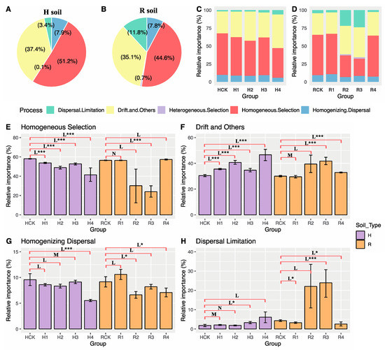 Relative importance of different ecological processes along a fertilization gradient. (A): Different ecological processes in H (loess brown) soil. (B): Different ecological processes in R (red) soil. Processes under different fertilization doses in H soil (C) and R soil (D). Changes in the relative importance of homogeneous selection (E), drift (F), homogenizing dispersal (G), and dispersal limitation (H) under fertilization and control conditions. Mean values and standard deviations of importance were used to plot data as bars, with the significance markers *** p < 0.01, and * p < 0.1 (n = 3). L, M, S, and N represent large (|d| > 0.8), medium (0.5 < |d| ≤ 0.8), small (0.2 < |d| ≤ 0.5), and negligible (|d| ≤ 0.2) effect sizes of fertilization, respectively, based on Cohen’s d. More details are provided in the Source Data file (Table S2).
