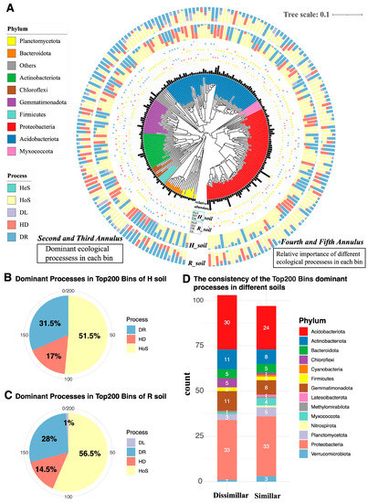 Assembly mechanisms across different phylogenetic groups. (A) A phylogenetic tree of the top 200 bins is displayed in the center, and the top taxa of the 200 bins are colored. Relative abundance of each bin (first annulus). Relative importance of different ecological processes in each bin (stacked bars in the fourth and fifth annuli). Light cyan bars, heterogeneous selection (HeS); light yellow, homogeneous selection (HoS); lilac, dispersal limitation (DL); orange, homogenizing dispersal (HD); light blue, drift (DR). Dominant process in the top 200 bins of H and R soils (second and third annuli). (B) Dominant process in the top 200 bins of H soil (second annulus). (C) Dominant process in the top 200 bins of R soil (third annulus). (D) The consistency of dominant processes for the top 200 bins dominant process in different soils. H soil: loess brown soil; R soil: red soil.