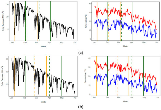 Daily solar radiation and temperature data (from Wagga Wagga Airport) over the duration of the pot experiments for (a) Chloris virgata and (b) S. oleraceus. Left-hand side panels represent daily solar exposure (MJ m−2), and right-hand side panels represent daily minimum (blue) and maximum (red) temperatures [23,24]. Solid orange lines denote the start (planting) and finish (harvest) of Experiment 1, and solid green lines denote the start and finish of Experiment 2. Dashed lines denote the day of spray application for Experiment 1 (orange) and Experiment 2 (green).