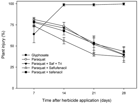 Visual plant injury assessments conducted every 7 days for 28 days after applications of paraquat, glyphosate and mixtures of paraquat and protoporphyrinogen oxidase inhibitors on stem-elongating Chloris virgata plants grown in pots in the outdoor growth facility at Charles Sturt University, Wagga Wagga, NSW in 2022. To highlight the differences in speed of activity and to identify recovery from specific herbicide treatment effects, the data presented are from the second (C. virgata-R2) of the repeated studies evaluating herbicides for potential use as spot-spray fallow weed control treatments. Presented means are back transformed. Error bars represent the standard error around the mean of three or four replicates. ‘Saf + tri’ refers to ‘Saflufenacil + Trifludimoxazin’.