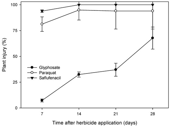 - Harre, N.T.; Duncan, G.W.; Young, J.M.; Young, B.G. Relating initial paraquat injury to final efficacy in selected weed species influenced by environmental conditions. Weed Technol. 2021, 35, 279–288. [Google Scholar] [CrossRef]