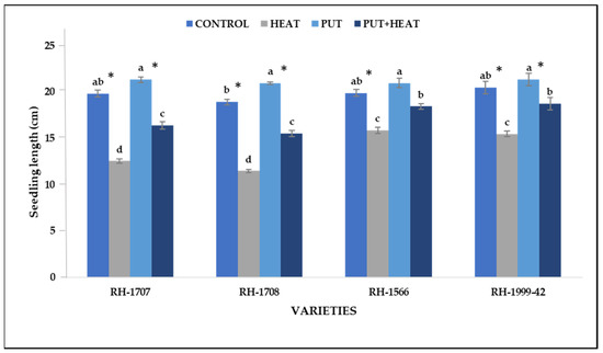 Effect of high temperature and Putrescine on seedling length in Brassica juncea seedlings. Each bar represents the mean (n = 3) and the error bar indicates the standard deviation. Asterisk (*) indicates a significant difference between the treatments. Different alphabets for each mean show statistically significant differences between the varieties according to the least significant difference (LSD) test (p < 0.05).