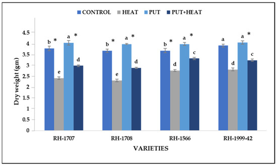 Effect of high temperature and Putrescine on dry weight in Brassica juncea seedlings. Each bar represents the mean (n = 3) and the error bar indicates the standard deviation. Asterisk (*) indicates significant difference between the treatments. Different alphabets for each mean show statistically significant differences between the varieties according to the least significant difference (LSD) test (p < 0.05).