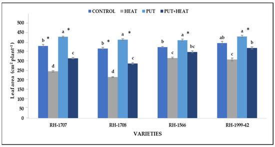 High-temperature stress reduces the leaf area per plant substantially. The reduction was more prominent in RH-1708 (68.96%) and RH-1707 (54.29%) than in RH-1999-42 (27.62%) and RH-1566 (17.73%). Under normal temperature, application of Put led to a slight increase in leaf area in RH-1708 (13.06%), RH-1707 (12.41%), RH-1566 (9.8%) and RH-1999-42 (8.76%). The combined treatment of plants with both high temperature and Put resulted in a reduction in the adverse effects caused by high-temperature stress. This combined treatment helped to maintain leaf area more efficiently, particularly in variety RH-1708 (33.07%) followed by RH-1707 (27.92%), RH-1999-42 (19.31%) and RH-1566 (9.98%) (Figure 6).