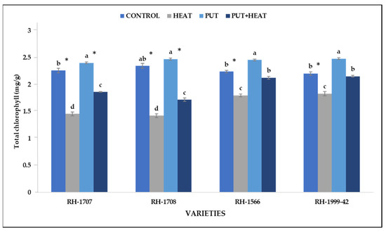 Effect of high temperature and Putrescine on chlorophyll content in Brassica juncea seedlings. Each bar represents the mean (n = 3) and the error bar indicates the standard deviation. Asterisk (*) indicates significant difference between the treatments. Different alphabets for each mean show statistically significant differences between the varieties according to the least significant difference (LSD) test (p < 0.05).