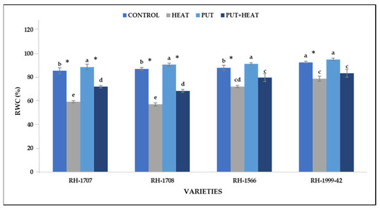 Effect of high temperature and Putrescine on RWC in Brassica juncea seedlings. Each bar represents the mean (n = 3) and the error bar indicates the standard deviation. Asterisk (*) indicates significant difference between the treatments. Different alphabets for each mean show statistically significant differences between the varieties according to the least significant difference (LSD) test (p < 0.05).