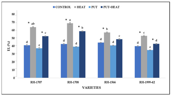 Effect of high temperature and Putrescine on electrolyte leakage in Brassica juncea seedlings. Each bar represents the mean (n = 3) and the error bar indicates the standard deviation. Asterisk (*) indicates significant difference between the treatments. Different alphabets for each mean show statistically significant differences between the varieties according to the least significant difference (LSD) test (p < 0.05).