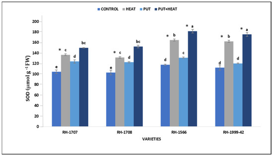 Effect of high temperature and Putrescine on SOD in Brassica juncea seedlings. Each bar represents the mean (n = 3) and the error bar indicates the standard deviation. Asterisk (*) indicates significant difference between the treatments. Different alphabets for each mean show statistically significant differences between the varieties according to the least significant difference (LSD) test (p < 0.05).