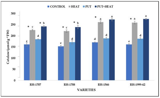 Effect of high temperature and Putrescine on catalase in Brassica juncea seedlings. Each bar represents the mean (n = 3) and the error bar indicates the standard deviation. Asterisk (*) indicates significant difference between the treatments. Different alphabets for each mean show statistically significant differences between the varieties according to the least significant difference (LSD) test (p < 0.05).