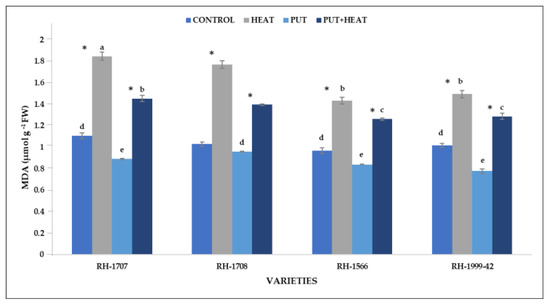 Effect of high temperature and Putrescine on MDA in Brassica juncea seedlings. Each bar represents the mean (n = 3) and the error bar indicates the standard deviation. Asterisk (*) indicates significant difference between the treatments. Different alphabets for each mean show statistically significant differences between the varieties according to the least significant difference (LSD) test (p < 0.05).