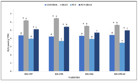 Effect of high temperature and Putrescine on H2O2 in Brassica juncea seedlings. Each bar represents the mean (n = 3) and the error bar indicates the standard deviation. Asterisk (*) indicates significant difference between the treatments. Different alphabets for each mean show statistically significant differences between the varieties according to the least significant difference (LSD) test (p < 0.05).