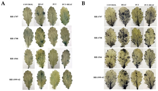 Histochemical analysis was conducted to assess the levels of superoxide ions using NBT staining, and localized cell death was monitored using Evans blue dye. The leaves were more extensively stained with blue spots under high-temperature treatment in both the staining procedures. The staining was more prominent in RH-1707 and RH-1708 showing more oxidative damage. However, much less accumulation was seen in leaves exposed to combined treatment of exogenous Put and high temperature. The overproduction of ROS at high temperatures might be attributed to imbalanced antioxidant enzyme activity and the expression of associated genes, which has the principal consequence of causing heat-induced stress [74]. Damage to cellular components such proteins, nucleic acids, lipids and metabolites as a consequence of an imbalance between ROS and antioxidants (both enzymatic and nonenzymatic) eventually affects cell viability and leads to cell death [75,76].