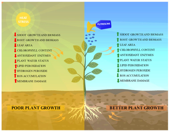 Schematic diagram displaying the role of Putrescine in mitigating the adverse effects of high-temperature stress in plants. Application of Putrescine improved plant growth by enhancing antioxidants, water relation, membrane stabilization and photosynthetic pigments, while reducing oxidative stress markers.