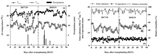 (a) Daily air temperatures (maximum, Tmax, and minimum, Tmin) and total precipitation. (b) Mean daytime solar radiation, daily evaporation, and relative humidity during the crop growth period in 2017/18 and 2018/19.