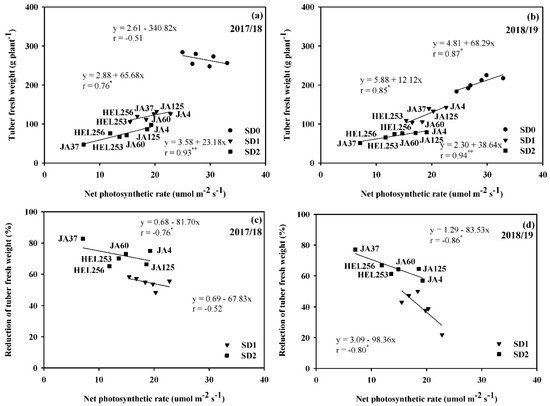 Relationship between net photosynthetic rate with tuber fresh weight (a,b) and reduction of tuber fresh weight (c,d) of six Jerusalem artichoke genotypes under optimal conditions (SD0), short-drought (SD1), and long-drought (SD2) durations in 2017/18 and 2018/19. *, ** Represent significant and highly significant with t-test p ≤ 0.05 and p ≤ 0.01, respectively.