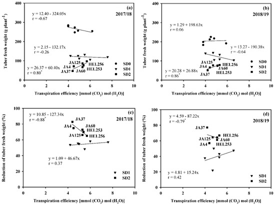 Relationship between transpiration efficiency with tuber fresh weight (a,b) and reduction in tuber fresh weight (c,d) of six Jerusalem artichoke genotypes under optimal conditions (SD0), short-drought (SD1), and long-drought (SD2) durations in 2017/18 and 2018/19. * Represent significance with t-test p ≤ 0.05.