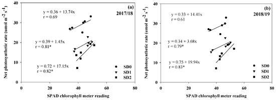 Relationship between SPAD chlorophyll meter reading and net photosynthetic rate of six Jerusalem artichoke genotypes under optimal conditions (SD0), short-drought (SD1), and long-drought (SD2) durations in 2017/18 (a) and 2018/19 (b). * Represent significance with t-test p ≤ 0.05.