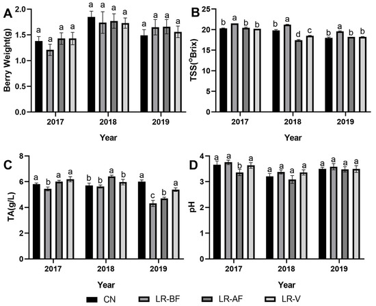 Berry weight (A), total soluble solids (B), titratable acidity (C) and pH (D) in Cabernet Sauvignon berries exposed to CN, LR-BF, LR-AF and LR-V in three years (2017, 2018, and 2019). LR-BF: leaf removal at 10 days before flower, LR-AF: leaf removal at 35 days after flowers, LR-V: leaf removal at veraison. TSS: total soluble solid content, TA: total titrated acid content. Different letters indicate significant differences (p < 0.05) among treatments using one-way ANOVA with the least significant different (LSD) test used to examine the means.