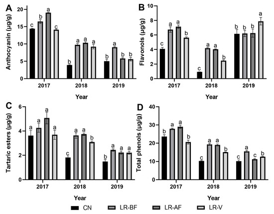 The anthocyanin (A), flavonols (B), tartaric esters (C), and total phenols (D) concentration in Cabernet Sauvignon berries exposed to CN, LR-BF, LR-AF and LR-V in three years (2017, 2018, and 2019). LR-BF: leaf removal at 10 days before flower, LR-AF: leaf removal at 35 days after flowers, LR-V: leaf removal at veraison. Different letters indicate significant differences (p < 0.05) among treatments using one-way ANOVA with the least significant different (LSD) test used to examine.