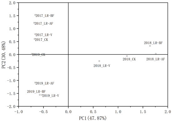 Principal component scatter plot on volatile compounds in Cabernet Sauvignon berries exposed to CN, LR-BF, LR-AF and LR-V in three years (2017, 2018, and 2019). LR-BF: leaf removal at 10 days before flower, LR-AF: leaf removal at 35 days after flowers, LR-V: leaf removal at veraison.