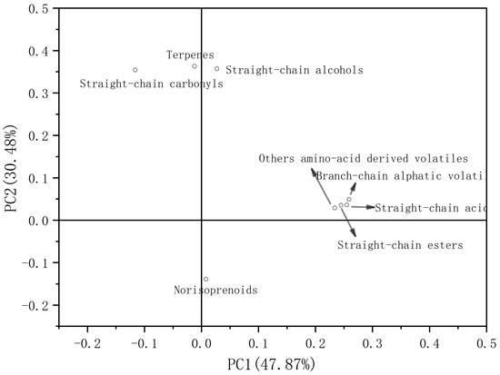 Figure 4 shows the corresponding loading plot on volatile families of compounds in grapes of leaf removal and control from 2017 to 2019. It can be seen from the graph that norisoprenoids, terpenes, straight-chain alphatic esters, straight-chain alphatic acids, aromatic volatiles and branch-chain alphatic volatiles in 2018 differ from that of the other two years. However, straight-chain alphatic alcohols and straight-chain alphatic carbonyls in 2017 and 2019 differ from that of 2018.