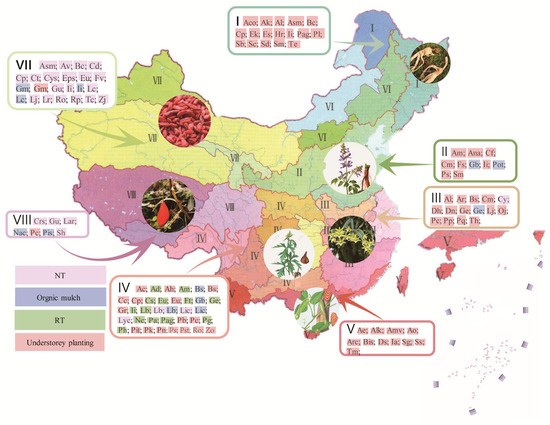 Examples of NT, RT, organic mulch, and understory planting in eight major production areas of terrestrial TCM plants. I, Northeast China: Aco, Aconitum coreanum; Ak, Aconitum kusnezoffii; Al, Atractylodes lancea; Asm, Astragalus membranaceus; Bc, Bupleurum chinense; Cp, Codonopsis pilosula; Ek, Epimedium koreanum; Es, Eleutherococcus senticosus; Hr, Hippophae rhamnoides; Ii, Isatis indigotica; Pag, Panax ginseng; Pl, Paeonia lactiflora; Sb, Scutellaria baicalensis; Sc, Schisandra chinensis; Sd, Saposhnikovia divaricata; Sim, Silybum marianum; Te, Tagetes erecta [23,24,25,26]. II, North China: Am, Atractylodes macrocephala; Ana, Anemarrhena asphodeloides; Cf, Cymbidium faberi; Cm, Chrysanthemum morifolium; Fs, Forsythia suspensa; Gb, Ginkgo biloba; Ii; Pg, Platycodon grandiflorus; Pot, Polygala tenuifolia; Ps, Polygonatum sibiricum; Sm, Salvia miltiorrhiza [27,28,29,30,31,32]. III, East China: Al; Ar, Anoectochilus roxburghii; Bs, Bletilla striata; Cm; Cy, Corydalis yanhusuo; Dh, Dendrobium huoshanense; Dn, Dendrobium officinale; Ge, Gastrodia elata; Lj, Lonicera japonica; Oj, Ophiopogon japonicus; Pc, Polygonatum cyrtonema. Pp, Paris polyphylla; Pq, Panax quinquefolium; Th, Tetrastigma hemsleyanum [33,34,35,36,37,38,39,40,41]. IV, Southwest China: Ac; Ad, Angelica dahurica; Ah, Arisaema heterophyllum; Am; Bs; Cc, Codonopsis cordifolioidea; Cp; Cs, Camellia sinensis; Eu, Eucommia ulmoides; Ft, Fagopyrum tataricum; Gb; Ge; Gr, Gentiana rigescens; Ii; Lb, Lilium brownii var. viridulum; Lic, Ligusticum chuanxiong; Lyc, Lysimachia christinae; Nc, Nepeta cataria; Pa, Plantago asiatica; Pag; Pb, Paris bashanensis; Pc, Polygonatum cyrtonema; Pg; Ph, Pseudostellaria heterophylla; Pit, Pinellia ternata; Pk, Polygonatum kingianum; Pn, Panax notoginseng; Ps; Pst, Psammosilene tunicoides; Ro, Rheum officinale; Zo, Zingiber officinale [42,43,44,45,46,47,48,49,50,51,52,53,54,55]. V, South China: Ae, Aspidistra elatior; Alk, Alpinia katsumadai; Amv, Amomum villosum; Ao, Alpinia oxyphylla; Arc, Areca catechu; Bis, Biancaea sappan; Ds, Desmodium styracifolium; Ia, Ilex asprella; Sg, Sarcandra glabra; Ss, Spatholobus suberectus; Tm, Taxus × media [56,57,58,59,60,61,62,63]. VI, Inner Mongolia: None. VII, Northwest China: Asm, Astragalus membranaceus; Av, Apocynum venetum; Bc; Cd, Cistanche deserticola; Cp; Ct; Cys, Cynomorium songaricum; Eps, Ephedra sinica; Eu; Fv, Foeniculum vulgare; Gm, Gentiana macrophylla; Gu, Glycyrrhiza uralensis; Ii; Lc, Lycium chinense; Lj; Lr, Lycium ruthenicum; Ro; Rp, Rheum palmatum; Tc, Tamarix chinensis; Zj, Ziziphus jujuba [64,65,66]. VIII, Qinghai-Tibet Plateau: Crs, Crocus sativus; Gu; Lar, Lamiophlomis rotata; Nac, Nardostachys jatamansi; Pc, Pyrola calliantha var. tibetana; Pis, Picrorhiza scrophulariiflora; Sh, Sinopodophyllum hexandrum [67,68,69,70].