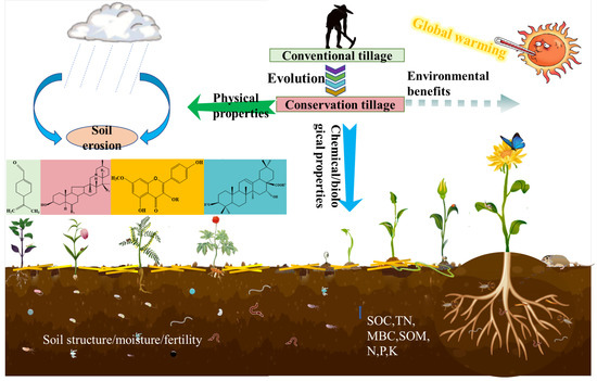 Presently, the robust development of global agriculture is challenged by a growing population, degraded farmland, and serious environmental issues, especially those related to climate change [1]. Since 2020, the COVID-19 pandemic and the fertilizer crisis have exacerbated soil degradation and crop yield decline [2], and the frequent outbreaks of major infectious diseases also require the sustainable production of plant-based drugs to meet the needs of disease prevention and treatment. Tillage is the manipulation of soil and plant residues by iron/steel tools to prepare an appropriate seedbed for crop cultivation, which has several advantages such as loosening soil, improving surface drainage, changing soil structure, increasing the release of nutrients from soil for crop growth, reducing competition from other plants, etc. [3,4]. However, intensive tillage practices may negatively affect the soil structure, soil porosity, storage of water in soil, aggregate stability, soil erosion, soil organic matter (SOM), soil micro- and macrofauna, and environmental quality by increasing greenhouse gas (GHG) emissions [5], and labor/production costs [6,7]. Such concerns have led to the search for tillage systems that minimize negative impacts on the environment while cost-effectively sustaining crop productivity [8]. Conservation tillage techniques, such as minimum tillage (MT ≈ reduced tillage (RT)) [9], no-tillage (NT; zero tillage) [10], and organic mulch [11,12], minimize the impacts of tillage on soil structure and soil biota [13], reduce soil erosion threats, increase soil organic carbon (SOC) [1], and may help reduce GHG emissions in comparison to conventional tillage (CT) [14]. To achieve these goals, conservation tillage should be adapted in terms of local conditions and flexibly implemented in crop production systems. Conservation tillage is any tillage and planting system that leaves at least 30% of the soil surface covered with crop residue after planting [15]. NT maintains more crop residue on the soil surface but might not allow profitable production if its other advantages cannot be fully utilized.