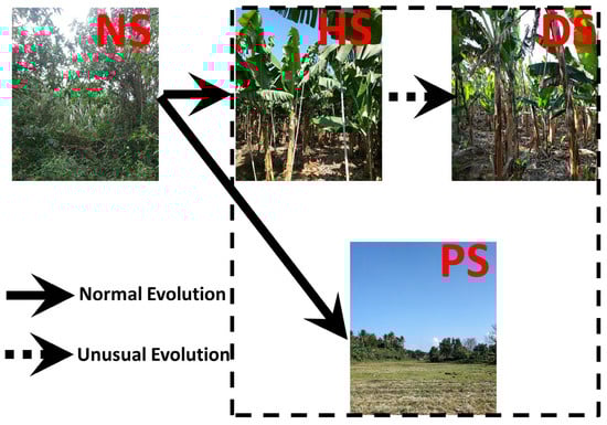 Soil utilization types concept map. NS: Natural forest soil; HS: Healthy banana garden soil; DS: Diseased banana garden soil; PS: Paddy soil. Normal evolution is the process of transforming forest soil into healthy banana garden soil (low Fusarium oxysporum f. sp. cubense) or rice soil, while unusual evolution is the process of transforming forest soil into diseased banana garden soil (high Fusarium oxysporum f. sp. cubense), which is no longer suitable for sustained use.