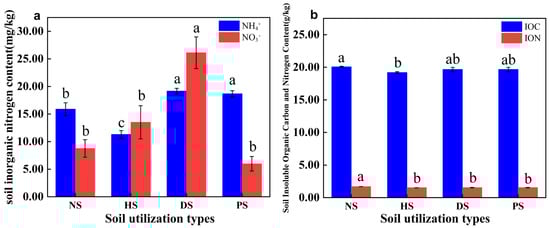 Inorganic N content, insoluble organic carbon and nitrogen content in different utilization types of soil. Inorganic N (NH4+, NO3−) content (a), insoluble organic carbon and nitrogen (b) in natural forest soil (NS), healthy banana soil (HS), diseased banana soil (DS), and paddy soil (PS). IOC: insoluble organic carbon; ION: insoluble organic nitrogen; NH4+: ammonium nitrogen; NO3−: nitrate nitrogen. Different letters indicate significant differences across different soil utilization types (p < 0.05).