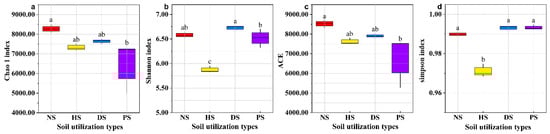 Alpha diversity of bacteria in different utilization types of soil. Chao 1 index (a), Shannon index (b), ACE index (c), Simpson index (d) in natural forest soil (NS), healthy banana soil (HS), diseased banana soil (DS), and paddy soil (PS). Different letters indicate significant differences across different soil utilization types (p < 0.05).