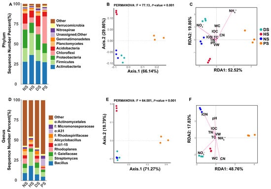 Community structure of bacteria in different utilization types of soil. The relative abundance (A), PCoA (B), and RDA (C) at the bacterial phylum level, the relative abundance (D), PCoA (E), and RDA (F) at the bacterial genus level in natural forest soil (NS), healthy banana soil (HS), diseased banana soil (DS), and paddy soil (PS). WC, water content; VW, volume weight; TC, total carbon; TN, total nitrogen; IOC, insoluble organic carbon; ION, insoluble organic nitrogen; NH4+: ammonium nitrogen, NO3−: nitrate nitrogen, CN: total organic carbon (TC)/total nitrogen (TN).