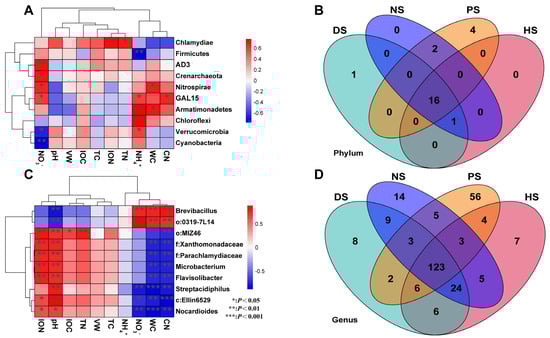 After conducting correlation analysis, it was found that NH4+ content had a significant positive correlation with Armatimonadetes and Chloroflexi at the phylum level, but a negative correlation with Firmicutes. NO3− had a significant negative correlation with Cyanobacteria and a positive correlation with AD3 (Figure 6A). At the genus level, WC, C/N, and NO3− were significantly positively correlated with Brevibacillus and O:0319-7L14, while pH was negatively correlated (Figure 6C).